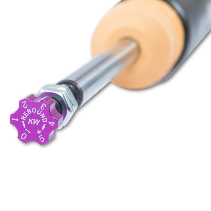 Is your factory sport suspension too firm? Do you want a sporty look and driving dynamics without having to compromise comfort? KW V2 comfort coilovers take the already stellar ride and reputation of KW suspensions coilover systems to the next level of comfort. Designed specifically to maximize comfort KW V2 Comfort coilovers provide a subtle lowering with adjustable ride height and rebound damping adjustability allowing the handling or the comfort to be individually tailored as desired via the integrated rebound adjustment knobs. KW V2 Comfort coilovers offer the perfect compromise of driving dynamics and ride comfort. With the KW V2 Comfort coilover kit, your comfort-oriented driving pleasure is the focus. That's why our test engineers evaluate the setups on numerous highways and country roads with various road surface types. The KW V2 Comfort coilover kits are suitable for all drivers who want to combine the joy of a decent lowering with driving comfort. With the 16-click adjustable rebound damping (TVR-A-technology), you can tune the KW dampers on the KW V2 Comfort coilover kits to make it more comfortable or sportier. The two-stage, patented TVR-A (Twin Valve Rebound - Adjustable) technology enables a small volume of oil to flow through an adjustable, conically shaped, low-speed bypass during low damper speeds, while in the case of higher damper speeds, the main rebound stage valve opens allowing a larger volume of oil to flow. This provides a big improvement in terms of ride comfort without influencing the safety-relevant high-speed range. There are 16 precise clicks available for individual settings, so you can choose between more comfort or more body control. The KW V2 Comfort coilovers, made using INOX-LINE stainless steel technology, enables a vehicle-specific lowering within the tested adjustment range of 10 to 40 mm.